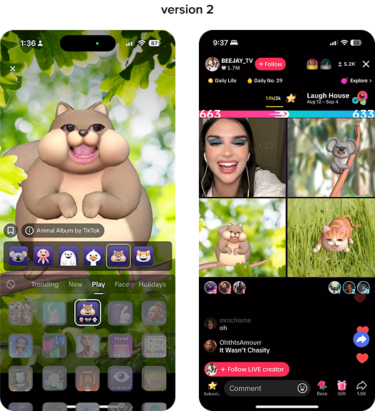 TikTok livestreaming focuses on real-time social engagement. Streamers can casually chat with friends, sell products, or earn money through gifts from viewers. My role was to design AR effects for livestreaming’s social environment to increase livestreaming durations.